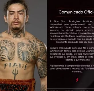 "Sempre preocupado com os fãs e com o público, Whindersson tomou essa decisão visando o cuidado integral de sua saúde. Ele está muito bem, feliz com sua evolução, e, em breve, estará de volta aos palcos fazendo o que mais ama", continuou.