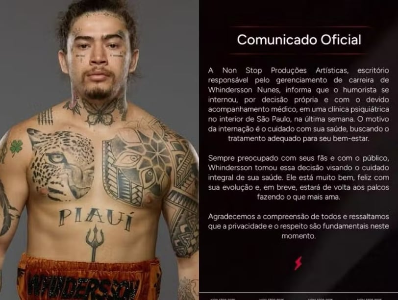 "A Non Stop Produções Artísticas, escritório responsável pelo gerenciamento da carreira de Whindersson Nunes, informa que o humorista se internou, por decisão própria, em uma clínica psiquiátrica no interior de São Paulo, na última semana. O motivo da internação é o cuidado com sua saúde, buscando o tratamento adequado para seu bem-estar", iniciou a nota.